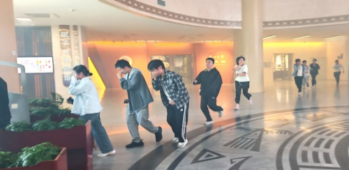 讲座结束后,随着模拟烟雾升起和应急广播的响起,紧张的疏散逃生演练正式拉开帷幕。在李家军馆长总指挥的指挥下,各部室负责人和安全员各就各位,组织全体参训人员沉着冷静,手捂口鼻,低姿弯腰,沿着预定疏散路线,快速、有序地从图书馆各楼层撤离至指定的安全集结地点。整个过程组织严密、行动迅速,达到了预期效果。