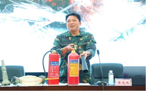 随后,保卫处黄光电老师进行消防安全讲座。他从基础消防知识理论出发,结合我校今年火情,深入剖析了火灾的成因与预防措施。他还系统讲解了灭火器的类型及适用范围,并重点演示了“提、拔、握、压”四字操作流程,接着讲解了消防水枪的使用方式。同时,还详尽讲解了至关重要的逃生技能,包括火灾发生时的疏散要领、如何规避浓烟、以及有效自救互救的方法。整场讲座内容详实,生动具体,极具针对性和指导性。
