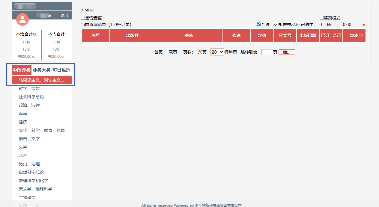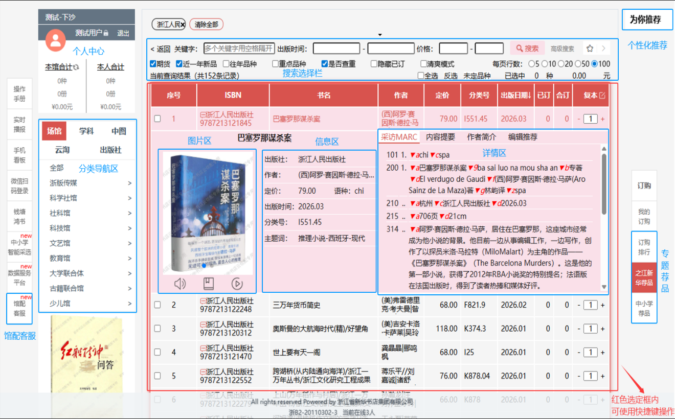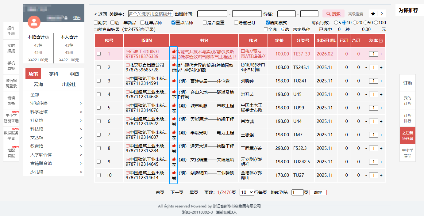 b.读者可在选购页面:进行订购、检索等操作,可按图书的中国图书馆分类、出版时间、定价等排序。也可按价格区间、出版时间段、重点图书进行模糊/精准筛选。